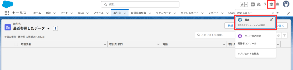 1.Salesforceの画面から「設定」にアクセス