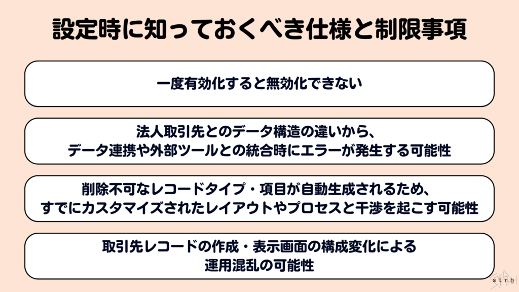 また個人取引先を前提に作成されたレコードタイプやページレイアウトなどが組織内に混在するため、UIや権限設計の見直しが必要となる場合もあります。有効化の判断は短期的なニーズだけでなく、長期的な運用設計まで見据えた上で行うべき設定になります。