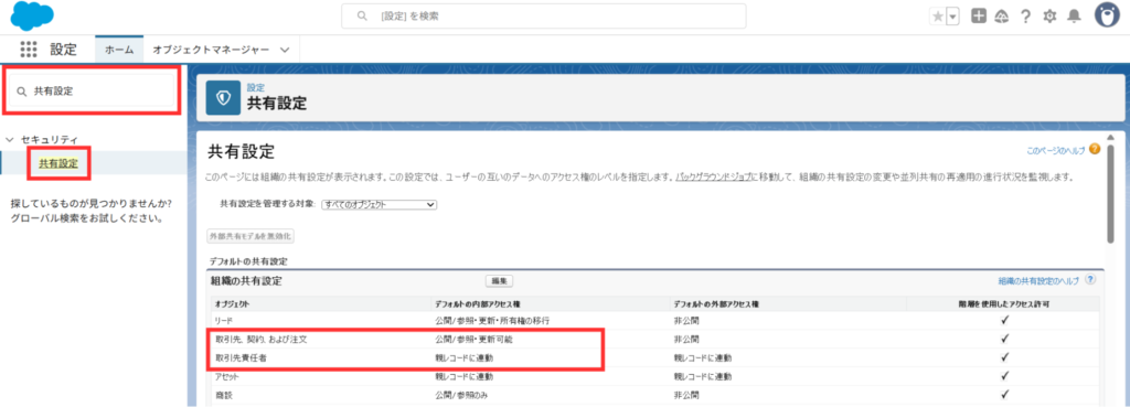 クイック検索から共有設定を検索し、「デフォルトの内部アクセス権」の取引先責任者を「親レコードに連動」に設定、または取引先と取引先責任者の両方を「非公開」に設定する。