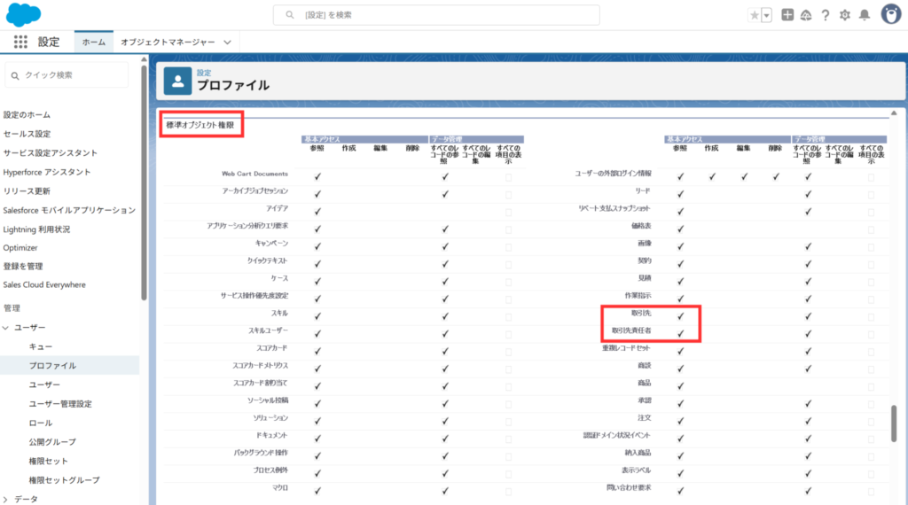 ①プロファイル設定:ユーザーに必要なオブジェクト(取引先、取引先責任者、レコードタイプなど)へのアクセス権限が付与されている必要があります。