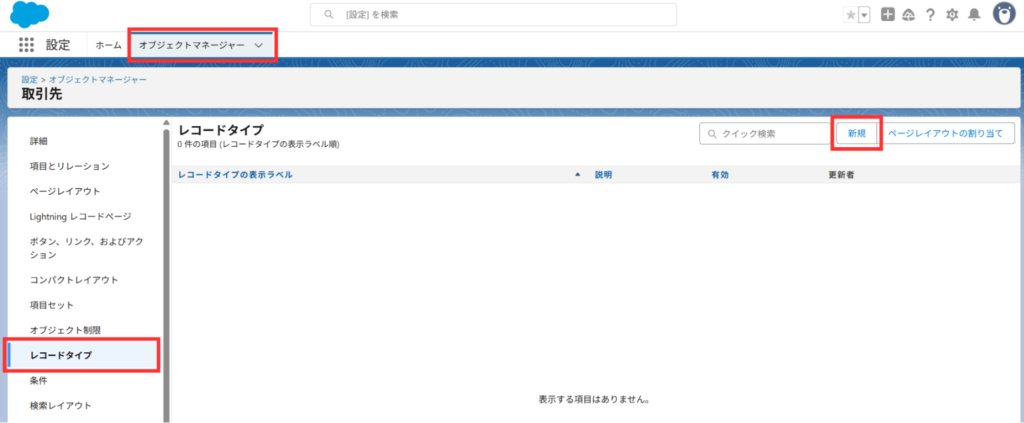 4.「②取引先レコードタイプを作成」が実行されていない場合は、オブジェクトマネージャーの取引先からレコードタイプを新規作成